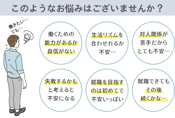 就労移行支援サモエドでは障がいのある方の「働きたい」「挑戦したい」を心から応援いたします。自信がない…不安いっぱい…最初はそう感じる事と思います。私たちはご利用者様一人ひとりの状況や個性に応じそれぞれのペースでサポートしていきます。ひとつひとつ課題をそれぞれのペースでクリアしていくことにより不安を解消していきます。