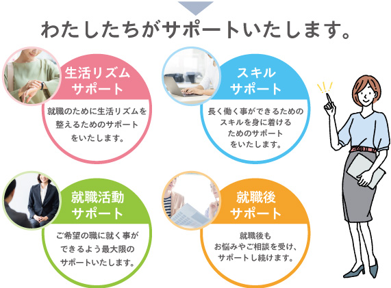 就労に伴い環境が変化すると、新たな課題がでてくることがあります。就労移行支援サモエドでは就労後も日常生活・社会生活においてサポートし、就労を続ける事ができるようサポートしております。